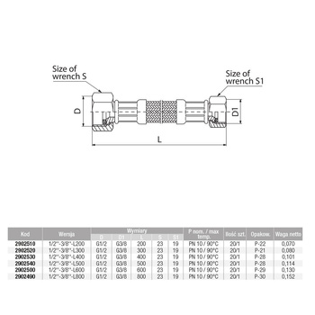 Wąż przyłączeniowy elastyczny VALVEX Viper Plus z oplotem (stal nierdzewna), GW x GZ, 1/2'' x 1/2'', długość 300 mm