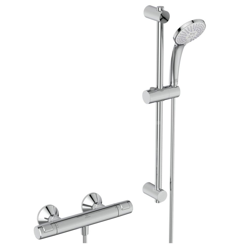 Bateria termostatyczna natryskowa naścienna Ceratherm T25. Standardowe przyłącza mimośrodowe. Głowica termostatyczna IS nowej technologii. Ceramiczny zawór G1/2 180°. Bez akcesoriów w komplecie. Uchwyt z ogranicznikiem temperatury do 40°C i przyciskiem redukującym wypływ o 50%. Zawór zwrotny. W komplecie zestaw natryskowy: słuchawka natryskowa 100 mm 3-funkcyjna Idealrain, z ogranicznikiem przepływu 8l/min oraz wąż natryskowy 1250 mm Idealflex i drążek natryskowy 600 mm z regulacją punktów mocowania do ściany. Zalecane dodatkowe elementy: nakładana półka do baterii termostatycznych Ceratherm T25, T50 i T100 A7215AA.
