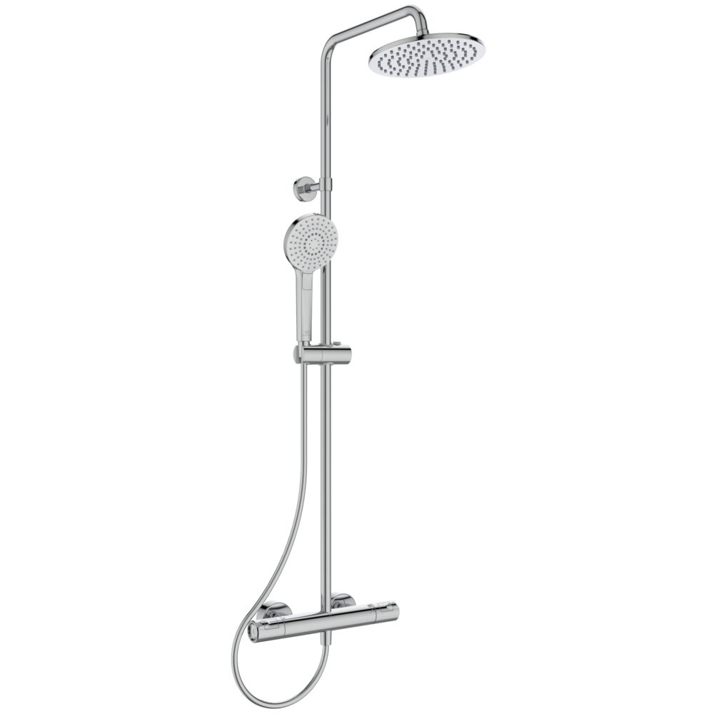 System natryskowy Ceratherm T50 natynkowy z akcesoriami. Standardowe przyłącza mimośrodowe. Głowica termostatyczna IS nowej technologii. Ceramiczny zawór G1/2 180°. Uchwyt z ogranicznikiem temperatury do 40°C i przyciskiem redukującym przepływ wody o 50%. Zawór zwrotny. System natryskowy w komplecie: deszczownica metalowa Ø200 mm, z ogranicznikiem przepływu 12 l/min oraz słuchawka natryskowa 110 mm 3-funkcyjna Idealrain Evo Round, z ogranicznikiem przepływu 8l/min, pozioma regulacja punktów mocowania do ściany oraz wąż natryskowy 1750 mm Idealflex. Zalecane dodatkowe elementy: przedłużenie do drążka natryskowego, 150 mm A861379AA lub przedłużenie do drążka natryskowego, 300 mm A861380AA.