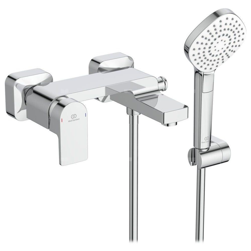 Bateria wannowo-natryskowa ścienna z akcesoriami. Głowica FirmaFlow ISI 38 mm z ogranicznikiem temperatury. Smukły, mosiężny, odlewany korpus. Automatyczny przełącznik. Metalowy uchwyt z logo Ideal Standard oraz nadrukowanymi czerwonymi i niebieskimi oznaczeniami. Zawór zwrotny. Perlator typu Cascade. Osłona śrub przyłączeniowych, ukryte przyłącza mimośrodowe baterii. Klasa akustyczna 1. Zgodna z EN817. Akcesoria: 3-funkcyjna słuchawka prysznicowa, ruchomy uchwyt ścienny, wąż natryskowy.