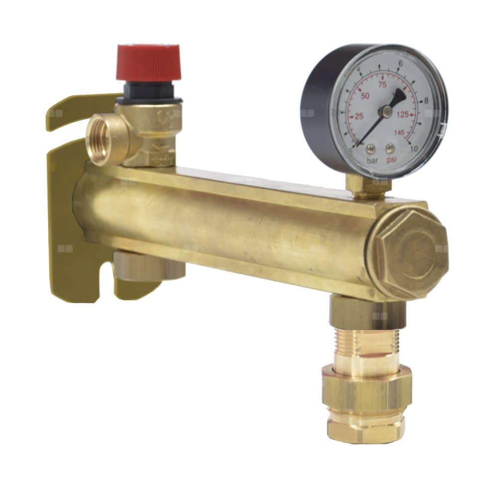 Grupa bezpieczeństwa mosiężna do c.w.u., 6 bar, z wyposażeniem, z szybkozłączem 3/4” do naczynia przeponowego