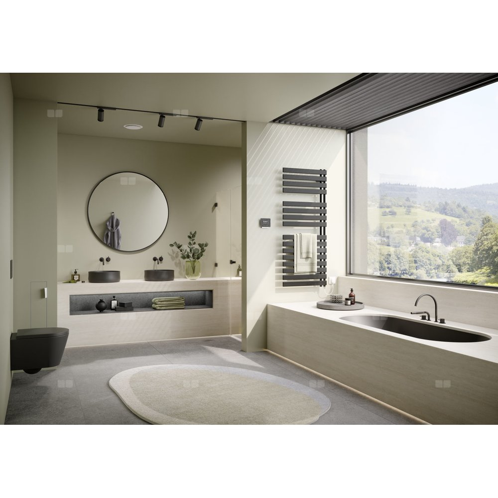 Asymetryczna forma i  rozmieszczenie płaskich prętów grzewczych w  blokach to cechy charakterystyczne Credo Half. Grzejnik jest z  jednej strony otwarty, co pozwala wygodnie zawieszać ręczniki. Grzejniki są dostępne w  wersjach prawej i  lewej. Opcjonalna półka z  drewna naturalnego stanowi elegancki, a  jednocześnie praktyczny akcent. Ciepła estetyka drewna w  ciekawy sposób kontrastuje ze stalowymi elementami grzejnika i  dodaje łazience przytulności.
