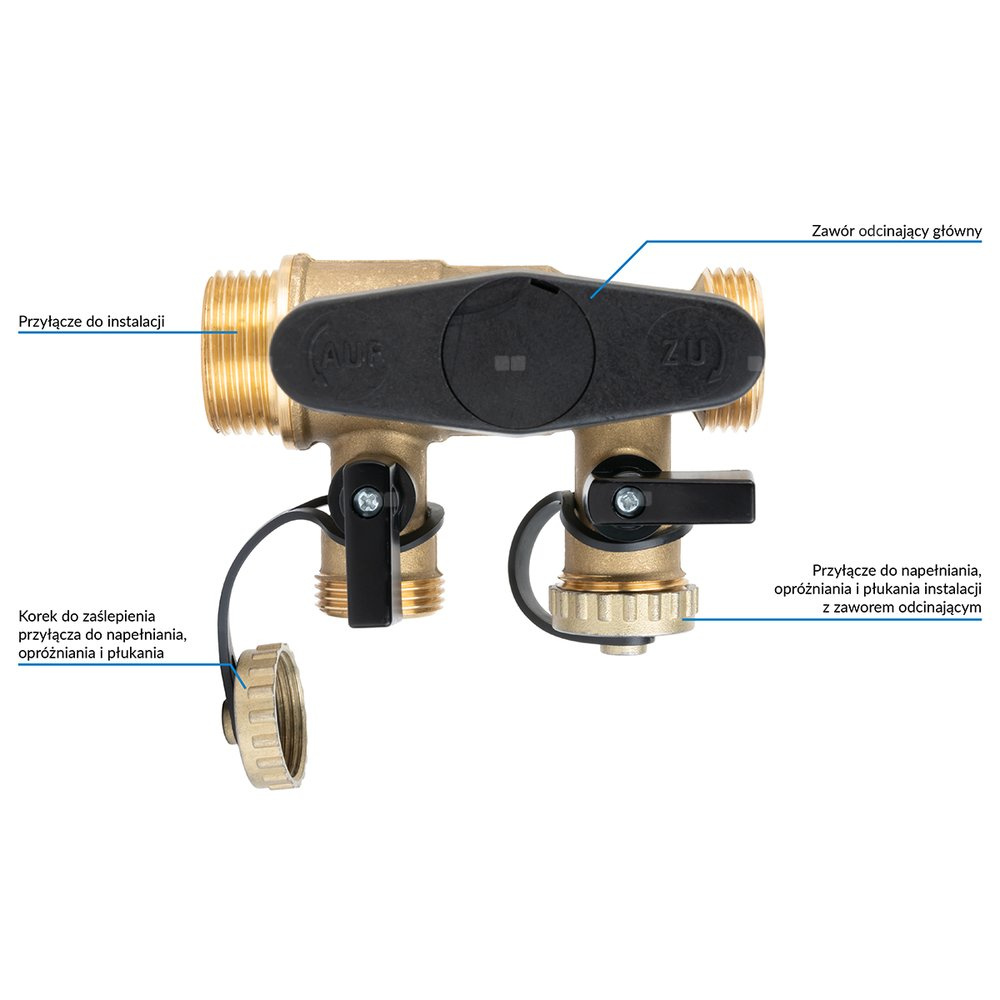 Umożliwia napełnienie, opróżnienie oraz wypłukanie/odpowietrzanie instalacji po podłączeniu do sieci wodociągowej lub stacji napełniającej