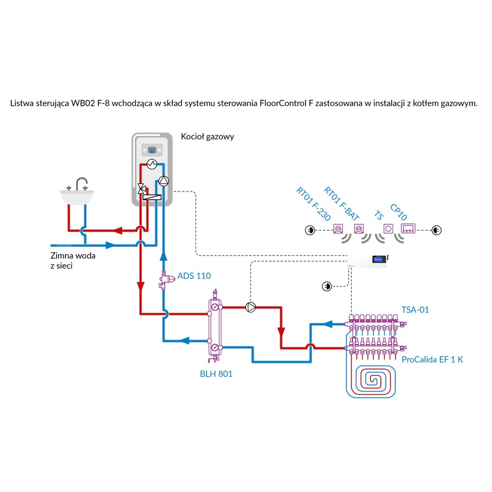 Steruje instalacją poprzez otwieranie i zamykanie przpeływu czynnika w poszczególnych pętlach instalacji płaszczyznowej za pomocą siłowników termoelektrycznych.
