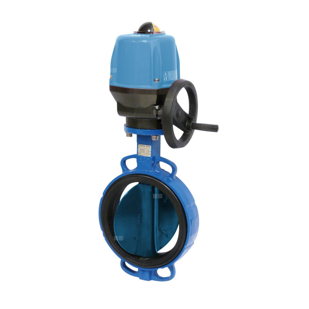 Przepustnica bezkołnierzowa SYLAX z napędem elektr. on/off SOCLA seria V 24V AC/DC, IP68, dysk: GGG40 epoksyd., wykładzina: EPDM, korpus: GG25 epoksyd., Pnom 0,6 MPa, tmax=120 st.C
