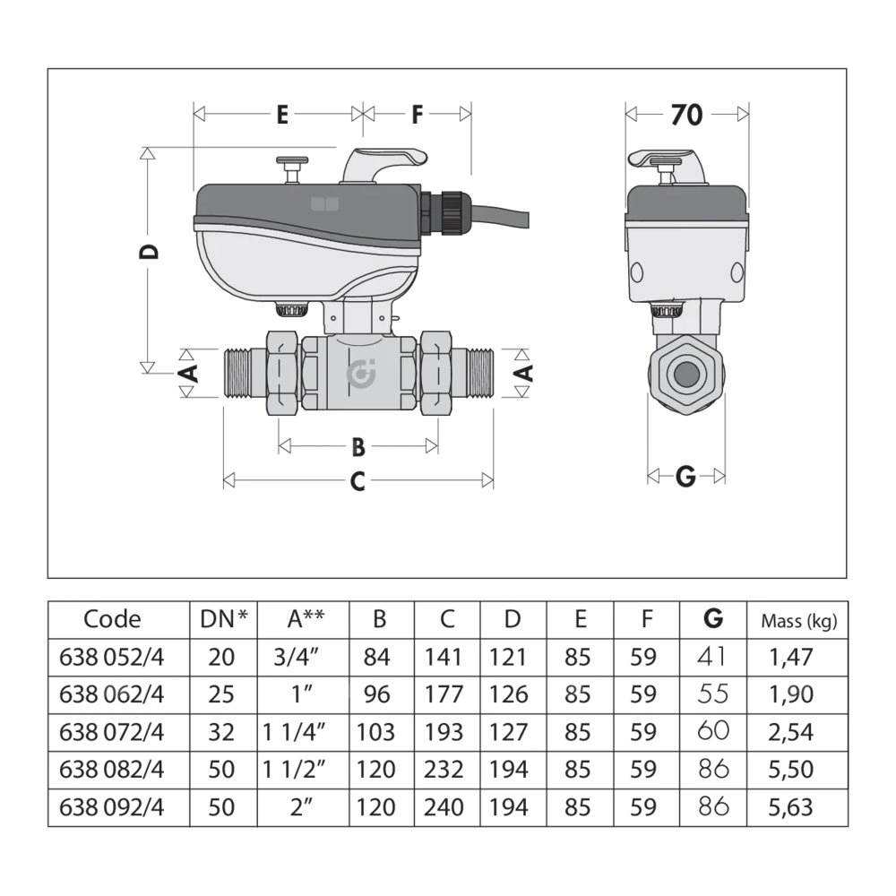 Dwudrożny zawór kulowy z napędem Z mikroprzełącznikiem pomocniczym. Przyłącze: R 1 1/2" (EN 10226-1) GZ. Maksymalne ciśnienie pracy: 16 bar. Zakres temperatury medium: -10–110 °C. Zakres temperatury otoczenia: -10–55 °C. Zasilanie elektryczne: 24 V (AC). Pobór mocy: 6 VA. Stopień ochrony: IP 65. Styk mikroprzełącznika pomocniczego (230 V): 6 (2) A. △p max.: 5 bar. Kv: 77 m³/h. Czas zadziałania: 50 s (obrót 90°).