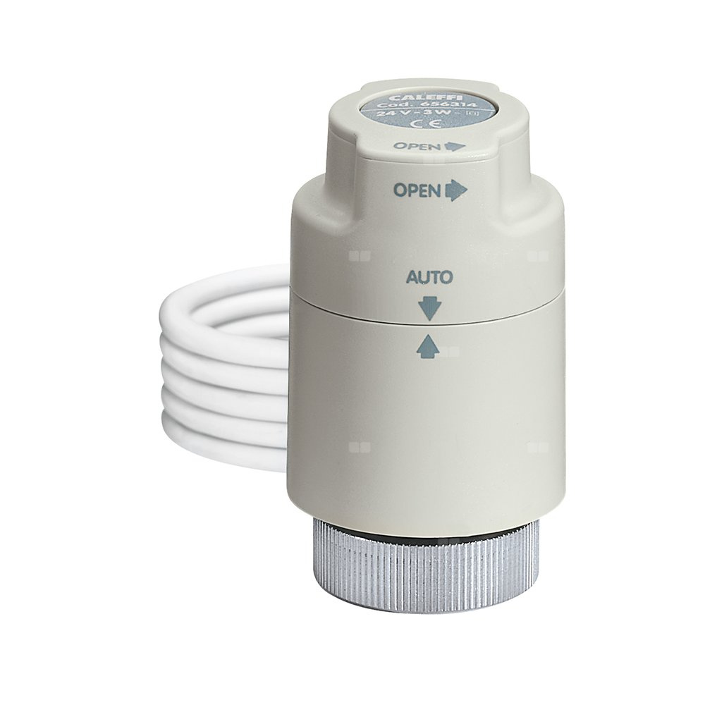 Siłownik termoelektryczny z ręcznym otwarciem i wskaźnikiem pozycji otwarcia Normalnie zamknięty. Dla zaworów z serii 338, 339, 401, 402, 425, 426, 421, 422, 230, 231, 232, 233, 234, 237, 220, 221, 222, 223, 224, 225, 226, 227, 455 i 456. Zakres temperatury otoczenia: 0–50 °C. Zasilanie elektryczne: 24 V (AC) / (DC). Pobór mocy: 3 W. Stopień ochrony: IP 40. Długość przewodu zasilająego: 0,8 m. Prąd rozruchowy: ≤ 1 A.