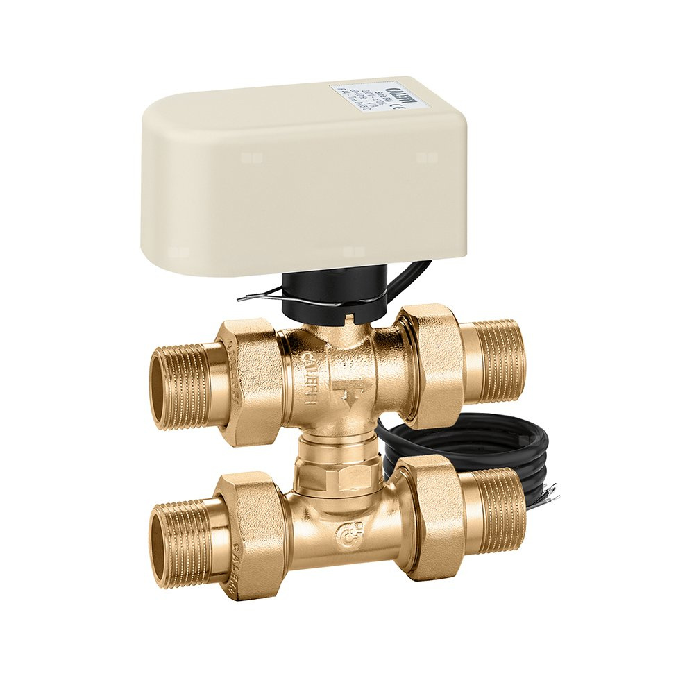 Trójdrożny zawór kulowy, z napędem z trójnikiem obejściowym Z mikroprzełącznikiem pomocniczym Z siłownikiem ze sterowaniem 3-punktowym Trójnik z dyszą U6. Regulowana odległość środkowych otworów wylotowych od 49 do 63 mm. Przyłącze: G 1" A (ISO 228-1) GZ. Maksymalne ciśnienie pracy: 10 bar. Zakres temperatury medium: -5–110 °C. Zakres temperatury otoczenia: 0–55 °C. Zasilanie elektryczne: 230 V (AC). Pobór mocy: 4 VA. Stopień ochrony: IP 44 (w pozycji pionowej), IP 40 (w pozycji poziomej). Długość przewodu zasilająego: 1 m. Styk mikroprzełącznika pomocniczego (230 V): 0,8 A. △p max.: 10 bar. Kv przelot: 10,3 m³/h. Kv obejście: 1,2 m³/h. Czas zadziałania: 40 s (obrót 90°).
