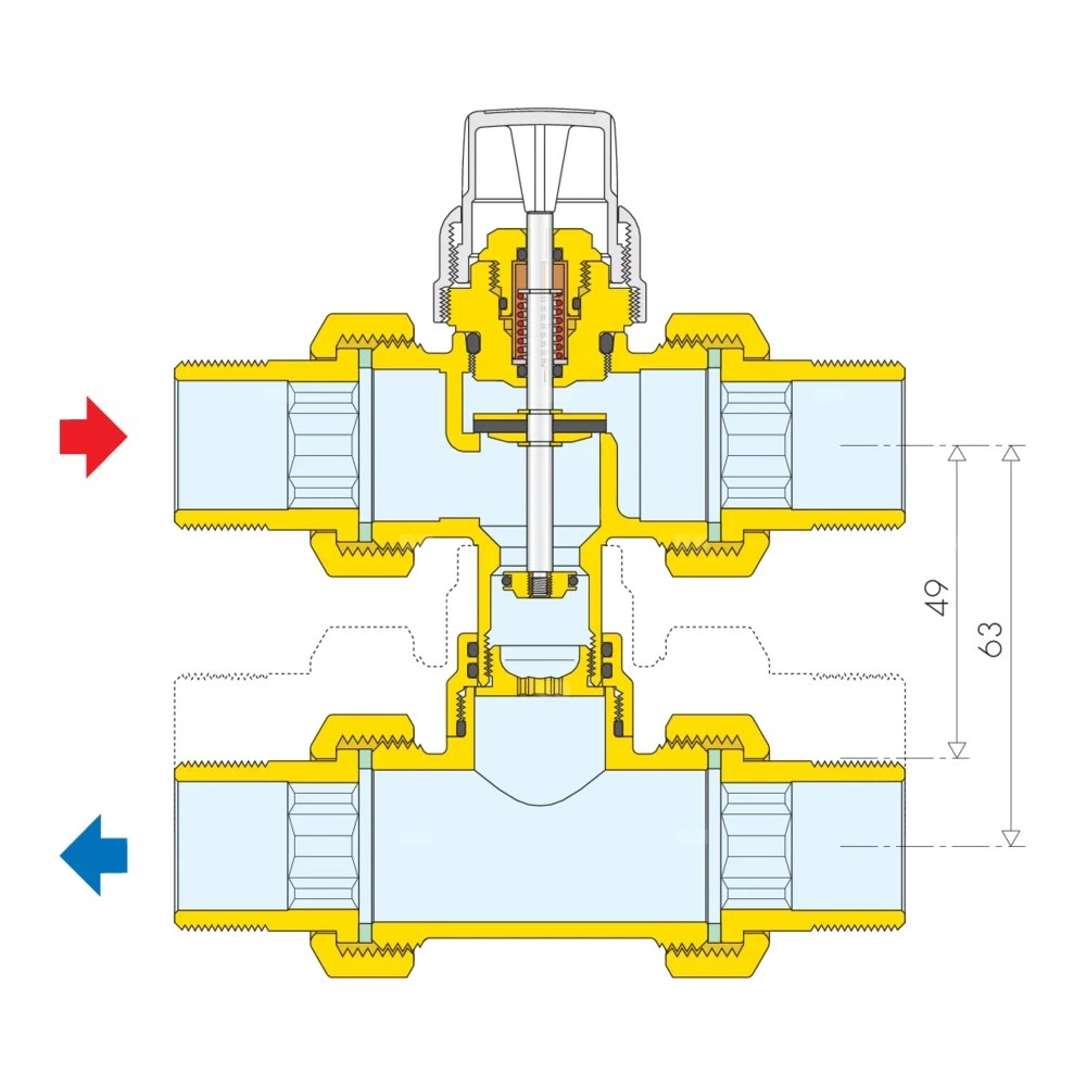 Trójdrożny zawór strefowy z trójnikiem obejściowym. Przystosowany do siłowników termoelektrycznych serii 6563, 6561, 6562 i 6564. Regulowana odległość środkowych otworów wylotowych od 49 do 63 mm. Trójnik z dyszą U6. Przyłącze: G 3/4" A (ISO 228-1) GZ. Maksymalne ciśnienie pracy: 10 bar. Zakres temperatury medium: 0–95 °C. △p max.: 1,2 bar. Kv przelot: 3,7 m³/h. Kv obejście: 1,0 m³/h.