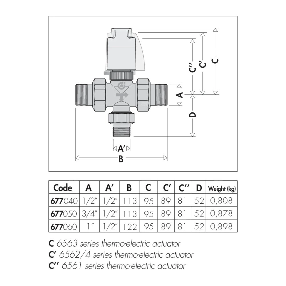 Zawór trójdrożny strefowy Przystosowany do siłowników termoelektrycznych serii 6563, 6561, 6562 i 6564. Przyłącze: G 1" A (ISO 228-1) GZ. Maksymalne ciśnienie pracy: 10 bar. Zakres temperatury medium: 0–95 °C. △p max.: 1,2 bar. Kv przelot: 3,7 m³/h. Kv obejście: 1,0 m³/h.
