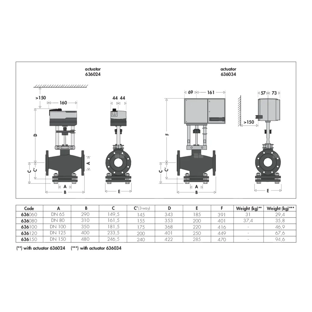Dwudrożny/trójdrożny zawór regulacyjny, kołnierzowy Współpraca z przeciwkołnierzami EN 1092-1. Charakterystyka stałoprocentowa (dwudrożny). Charakterystyka stałoprocentowa/liniowa (trójdrożny). Zawór dwudrożny może zostać przekształcony do wersji trójdrożnej poprzez usunięcie elementu zaślepiającego by-pass. Przyłącze: DN 80 (EN 1092-1) PN 16. Maksymalne ciśnienie pracy: 16 bar. Zakres temperatury medium: 0–100 °C. PN (Ciśnienie nominalne): PN 16. Kv: 100 m³/h. Materiał: żeliwo.