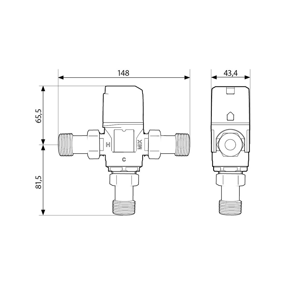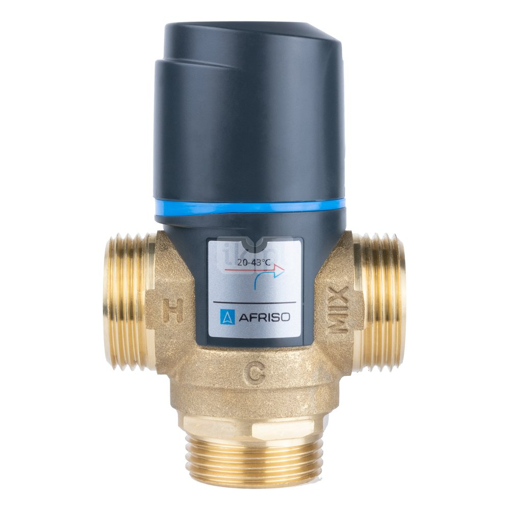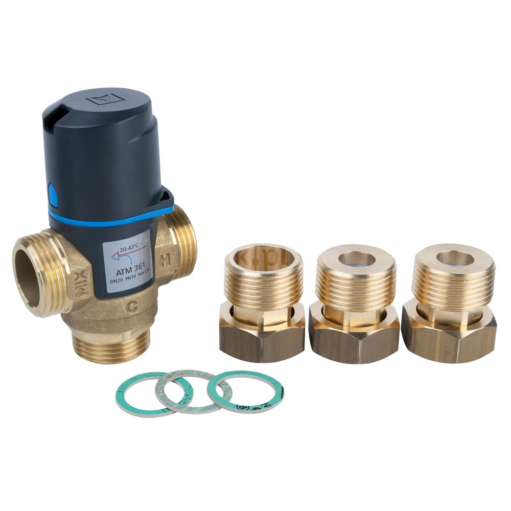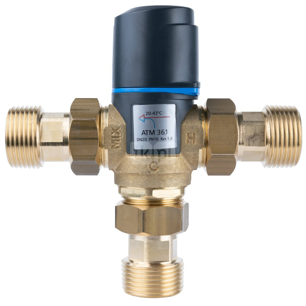 Zawór regulacyjny termostatyczny do wody ciepłej AFRISO ATM 361 ze śrubunkami mosiądz GZ 1'', DN 20, zakres temp. 20...43'C, Kvs 1.6m3/h, max. 90'C, max. 10bar