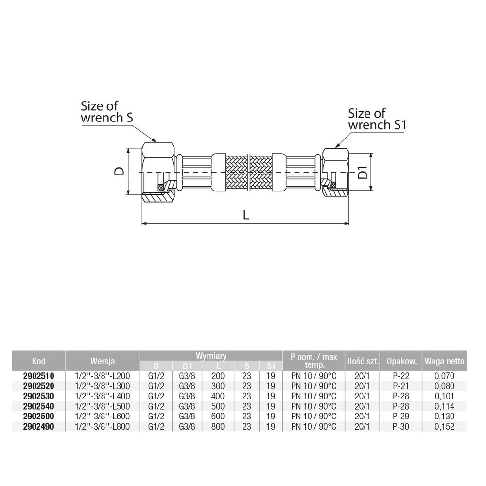 Wąż przyłączeniowy elastyczny VALVEX Viper Plus z oplotem (stal nierdzewna), GW x GW, 1/2'' x 3/8'', długość 800 mm