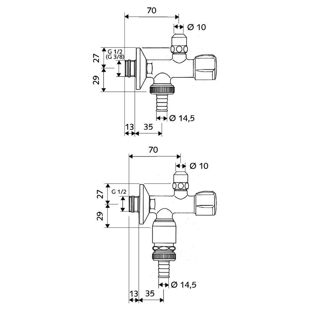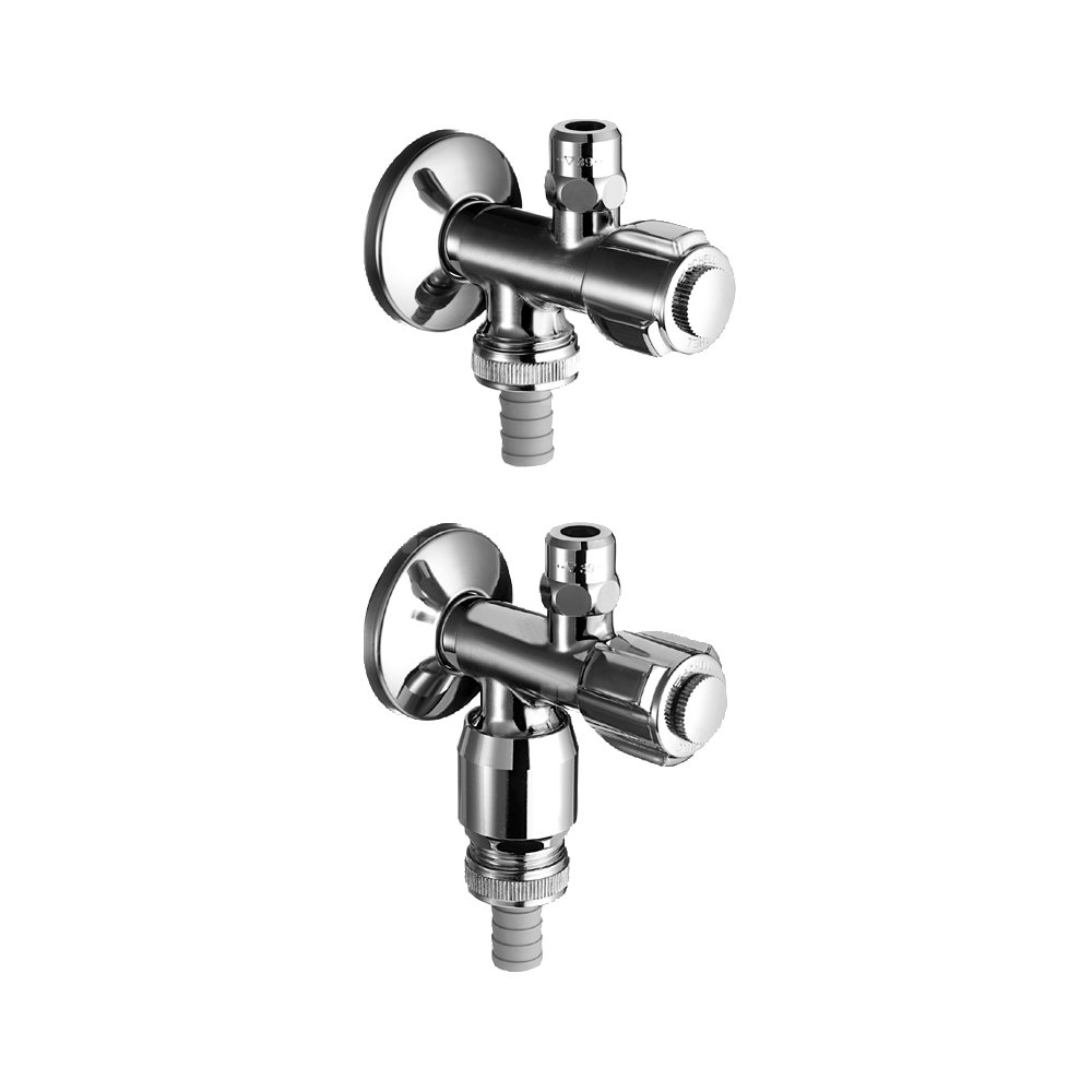 Zawór kątowy ze zintegrowanym zaworem przyłączeniowym dla urządzeń gospodarstwa domowego. Napęd zaworu kątowego pod kołpakiem.