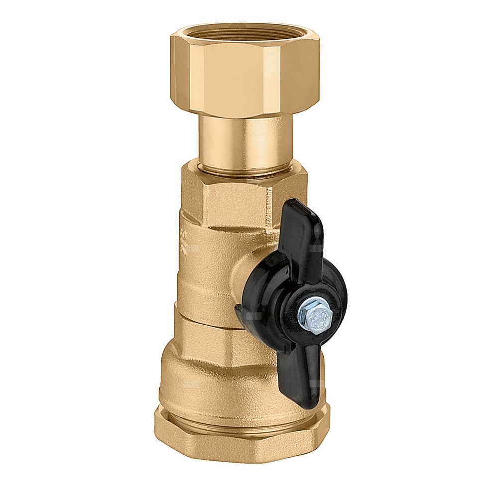 Zawór kulowy ze złączką do rury polietylenowej. przyłącze rozdzielacza : 42 p.2,5 TR, wlot, nakrętka mocująca. podłącznie rury: Ø 25, wylot. Maksymalne ciśnienie pracy: 16 bar. Zakres temperatury medium: -10–40 °C. Zakres temperatury otoczenia: -20–60 °C. Maksymalne stężenie glikolu: 50 %. Medium: woda, Roztwory glikolu, Roztwory soli. Materiał: mosiądz.