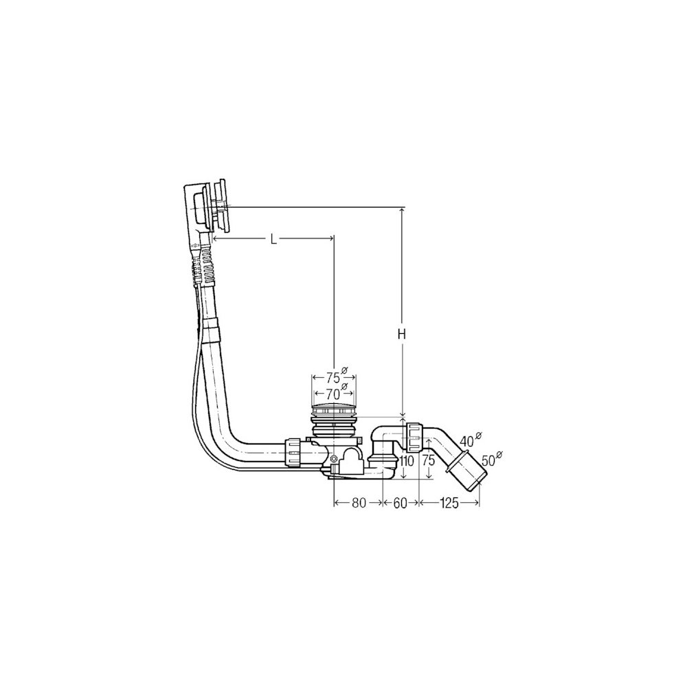 Multiplex Trio F-komplet odpływowo-przelewowy nr wzoru 6145.5 DN: 40/50 długość cięgna Bowdena: 725 L: 130–370 H: 180–370 wanna z odpływem pośrodku