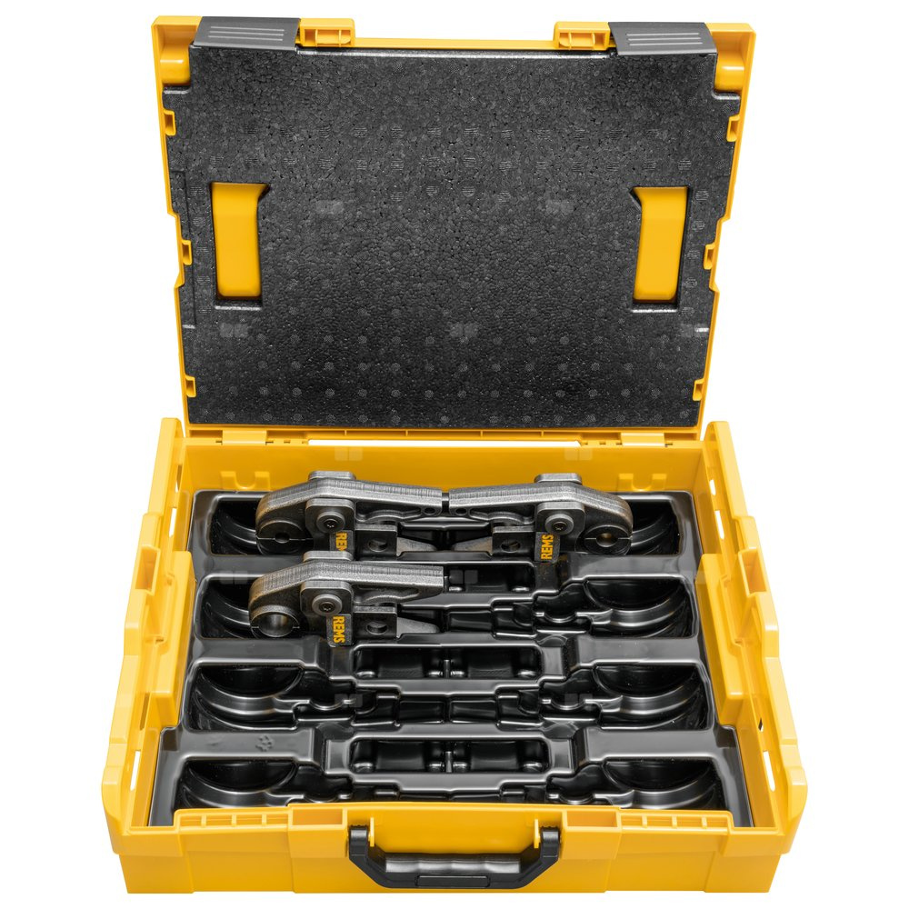 Zestaw cęgów zaciskowych REMS. Cęga zaciskowa REMS (PZ-2B) z 2 obrotowymi mono-blokowymi szczękami. O dużej obciążalności z kutej, ciągliwo-twardej i odpowiednio hartowanej stali specjalnej. Kontury zaciskowe są specyficzne dla każdego systemu i odpowiadają konturom poszczególnych systemów zaciskowych. Zapewnia to bezproblemową zgodność i pewne zaciskanie. Napęd przez prasy promieniowe REMS 32 kN i odpowiednie prasy promieniowe innych producentów o sile posuwu 32 kN. W skrzynce systemowej L-Boxx.