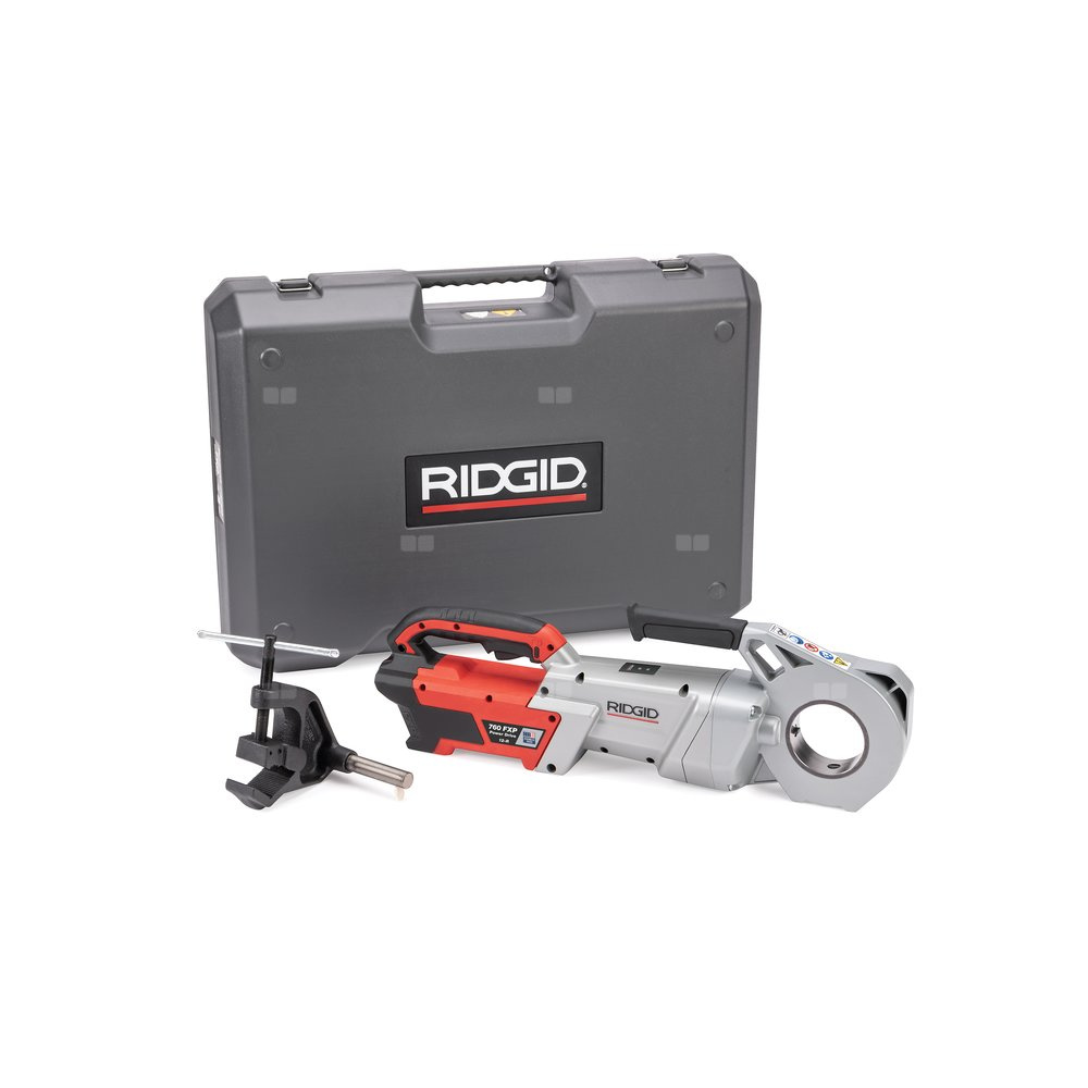 Gwintownica z napędem mechanicznym 760 FXP (12-R), 2 akumulatory FXP 4 Ah, ładowarka FXP (wtyczka EU i UK), zestaw głowicy gwinciarskiej 1/2-2" 12-R BSPT, ramię wsporcze, walizka