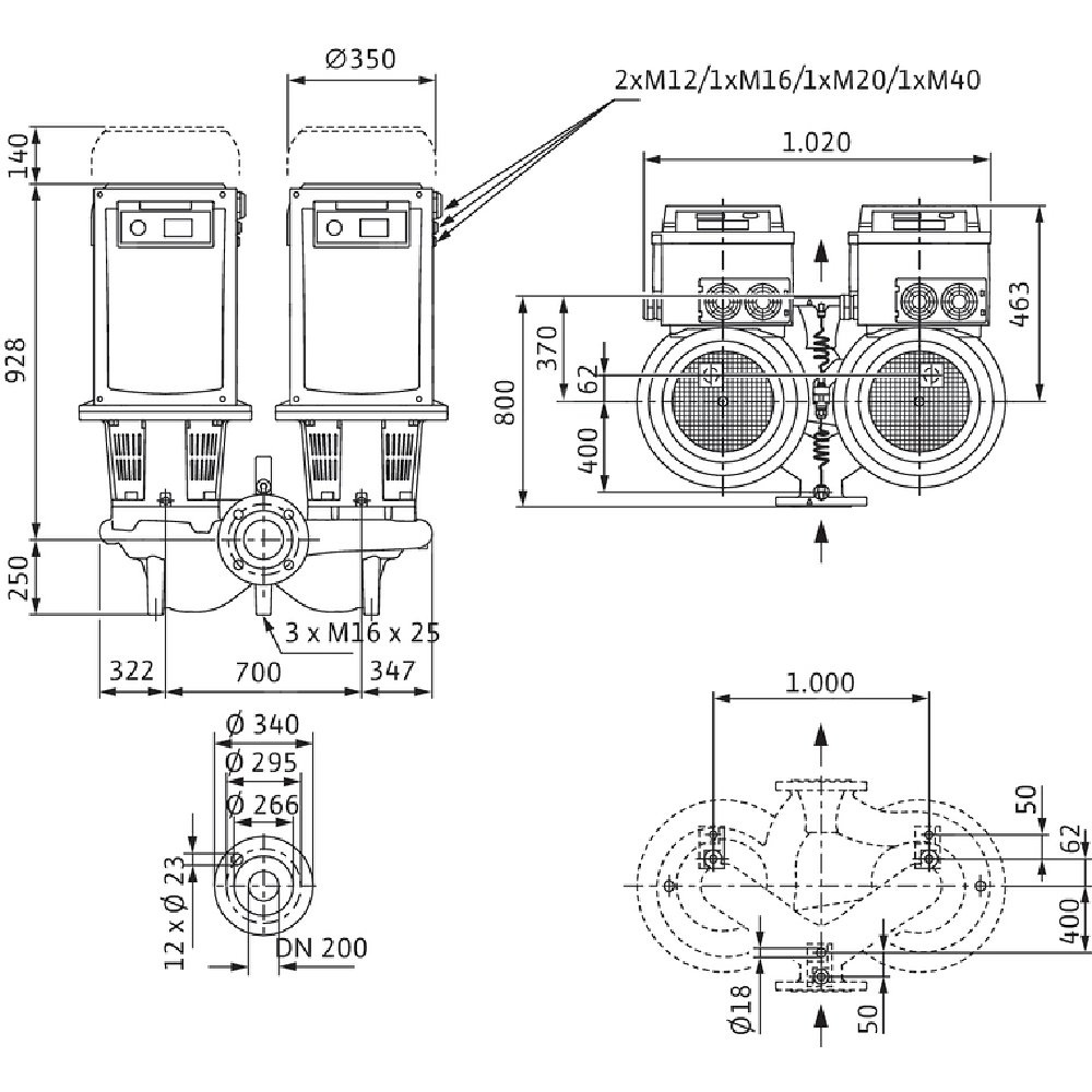 Pompa obiegowa WILO CronoTwin-DL-E 200/240-15/4-R1-S1 typu in-line z silnikiem znormalizowanym 50/60 Hz, moc silnika 15kW 26.5 A 1450 obr/min, wlot Kołnierz DN 200