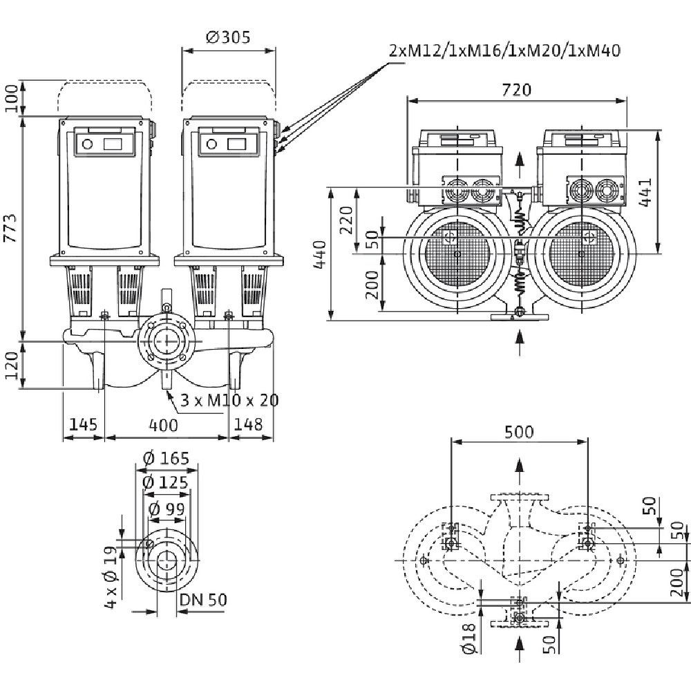 Dławnicowa pompa podwójna o konstrukcji Inline do montażu na rurociągu lub do ustawienia na fundamencie z wbudowaną przetwornicą częstotliwości do regulacji elektronicznej m.in. wg stałej i zmiennej różnicy ciśnień (Δp-c/Δp-v)