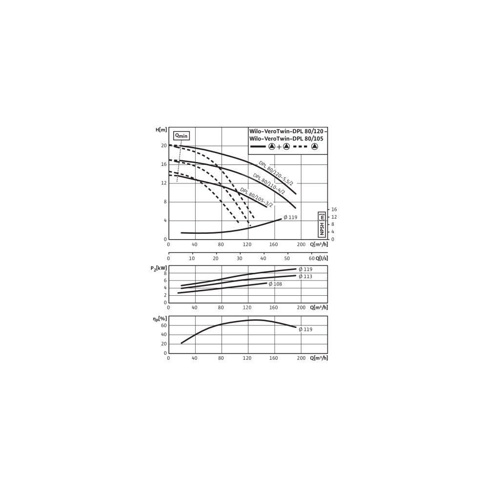 Pompa obiegowa WILO VeroTwin-DPL 80/105-3/2-IE3 typu in-line z silnikiem znormalizowanym 50 Hz, moc silnika 3kW 6.15 A 2900 obr/min, wlot Kołnierz DN 80