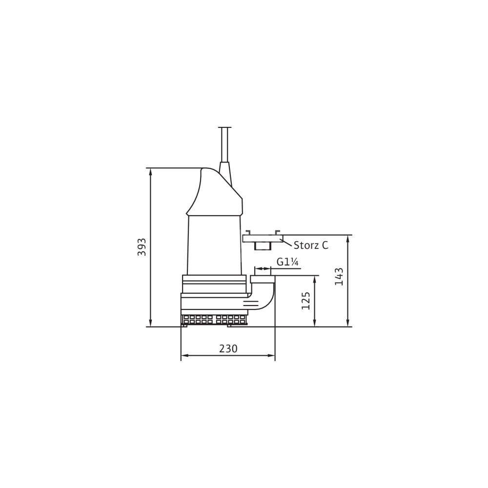 Całkowicie zanurzona pompa zatapialna do wody zanieczyszczonej, pionowe ustawienie mokre, do tłoczenia wody zanieczyszczonej i zawierającej piasek Korpus hydrauliczny i wirnik z żeliwa szarego, korpus silnika z aluminium. Przyłącze tłoczne z pionowym odpływem ciśnieniowym i złączem typu Storz. Samochłodzący silnik w wersji na prąd zmienny jednofazowy, z odłączanym kablem zasilającym i wyłącznikiem pływakowym z wtyczką z uziemieniem i kondensatorem roboczym. Do uszczelnienia po stronie medium i silnika służy uszczelnienie mechaniczne. Agregat można stosować w podsysającym trybie pracy bez ograniczeń.