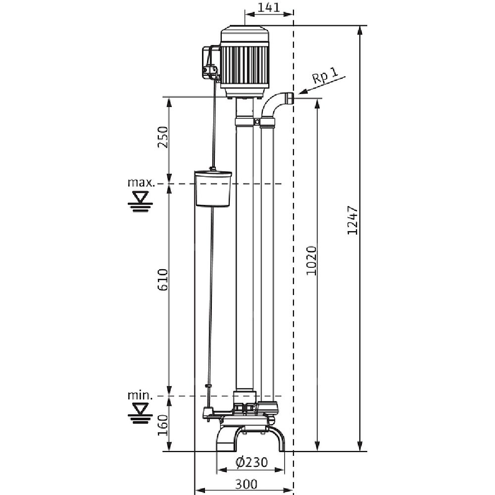 Pionowa pompa do wody brudnej w ścianie nienośnej do tłoczenia mediów o temperaturze maks. 95 oC, korpus hydrauliczny z żeliwa szarego, wirnik ze stali. Przyłącze tłoczne z poziomym odpływem ciśnieniowym i gwintem wewnętrznym. Napęd następuje poprzez silnik znormalizowany w wersji na prąd zmienny, korpus silnika z aluminium. Zabezpieczenie silnika i kabel zasilający zapewnia Użytkownik. Hydraulika i silnik są sztywno połączone za pomocą wału pompy (w rurze ochronnej wału). Łożyskowanie wału pompy następuje przez łożyska ślizgowe, smarowanie łożysk ślizgowych przez przetłaczane medium. Celem automatycznej pracy zamontowano wyłącznik pływakowy. Punkty przełączania można regulować za pomocą ograniczników.