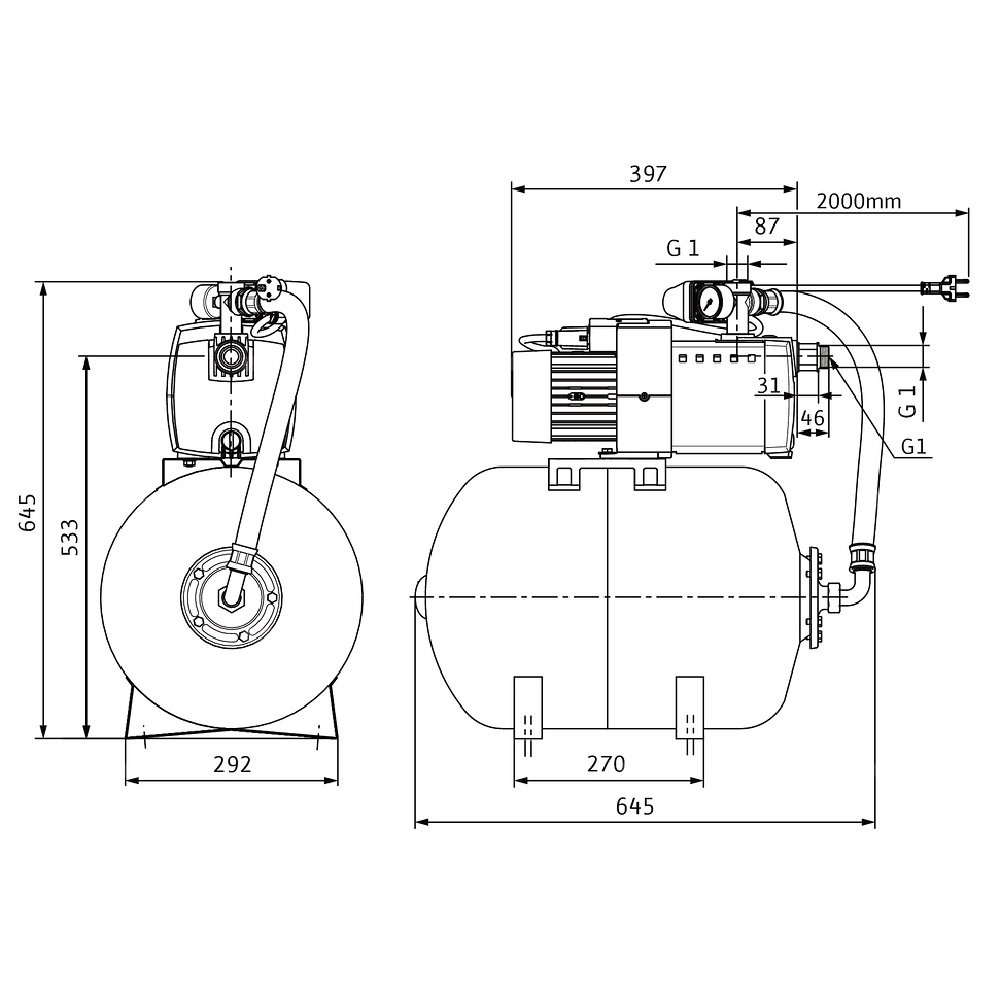Fabrycznie zamontowana i okablowana jednostka, złożona z wielostopniowej, poziomej pompy wirowej w wersji dławnicowej, samozasysająca, z silnikiem z bezpośrednim przyłączem kołnierzowym (uszczelnienie przepustu wałowego w postaci niewymagającego konserwacji uszczelnienia mechanicznego) oraz z ciśnieniowym naczyniem przeponowym