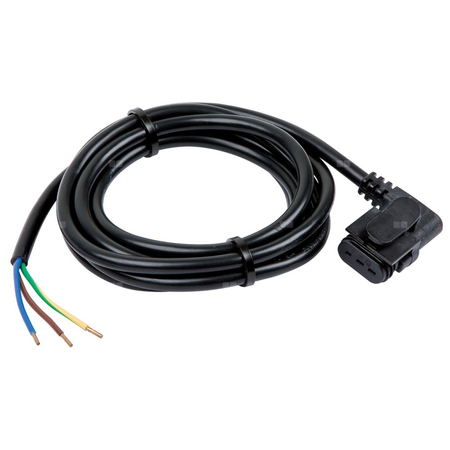 Wtyczka kątowa, lewa, posiada zamocowany na stałe (zalany) kabel zasilający o długości 2 m, z wolnymi końcówkami umożliwiającymi podłączenie napięcia zasilania