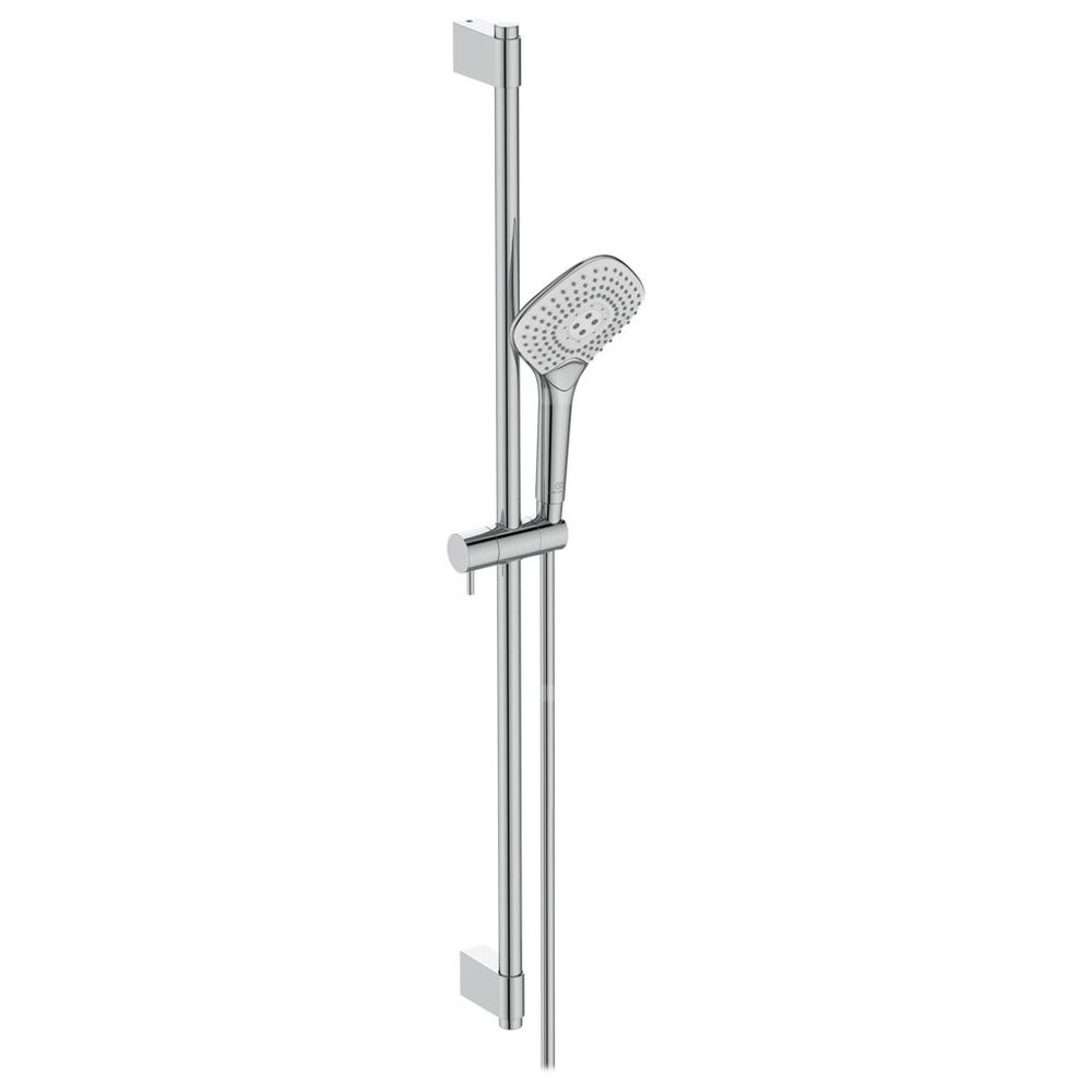 Metalowy drążek prysznicowy długości 900 mm. Regulowane metalowe mocowanie słuchawki. Wąż Idealflex 1750 mm z tworzywa odpornego na osad kamienia. Trzyfunkcyjna słuchawka średnicy Ø 134 mm. Rodzaje strumienia wody: deszcz, drop jet, masaż. Wybór strumienia wygodnym przyciskiem Navigo. Gumowe końcówki dysz zapobiegające osadzaniu się kamienia. Ogranicznik przepływu wody do 8 l/min. Minimalne ciśnienie wody 0,1 bar.