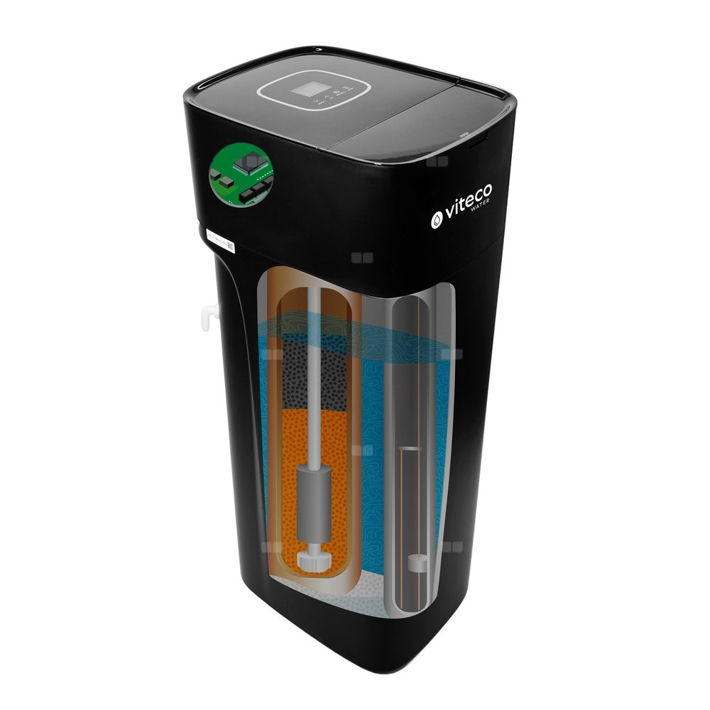 Kompaktowe wielofunkcyjne urządzenie do zmiękczania wody ze złożem węgla aktywnego, KDF, żywicą monosferyczną i alarmem solnym Viteco CS QUADRO CARBON MONO 30, z kompletnym zestawem filtracji wstępnej i zestawem do mierzenia twardości wody