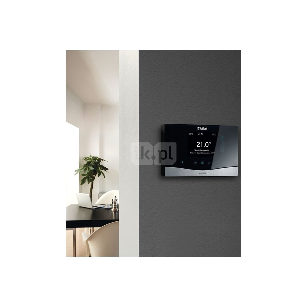 ze złączem komunikacyjnym eBUS, wyświetlaczem dotykowym, z zegarem programującym tygodniowym, sterujący obiegiem c.o., obiegiem c.w.u.,(komfortem c.w.u./zasobnikiem c.w.u./zasobnikiem warstwowym actoSTOR), oraz pompą cyrkulacyjną i/lub zewnętrzną pompą c.o. Aplikacja na urzadzenia mobilne ( smartfon, tablet wyposażony w system iOS lub Android)