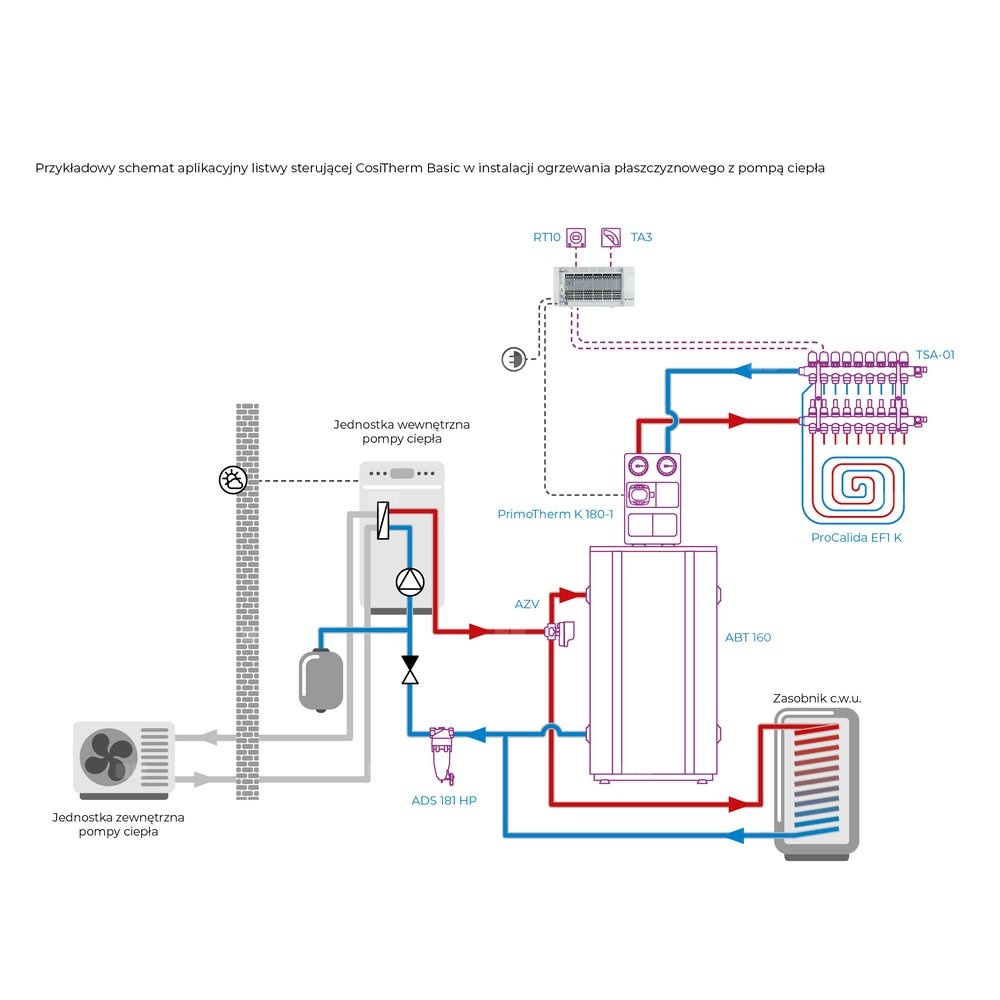 Reguluje temperaturę w pomieszczeniach na podstawie sygnałów z termostatów pokojowych.