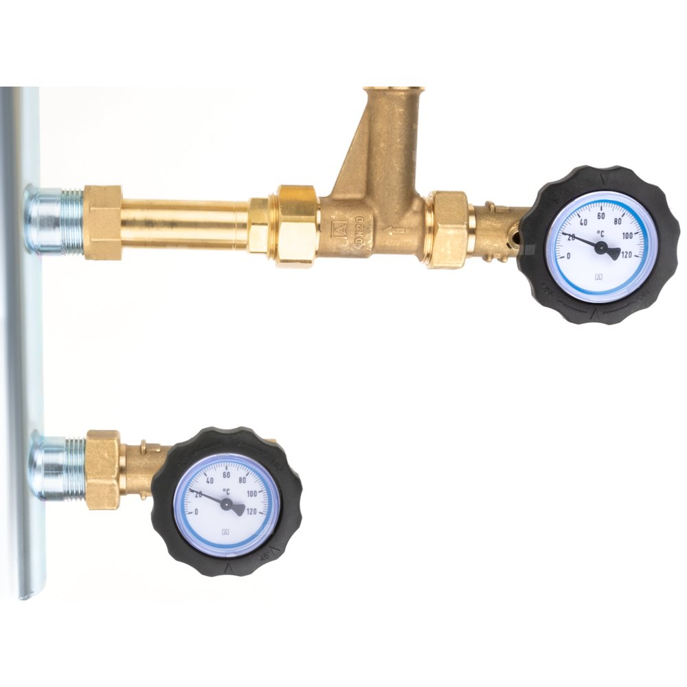 Zawory odcinające ze zintegrowanymi termometrami do kontroli temperatury medium na każdym przyłączu.