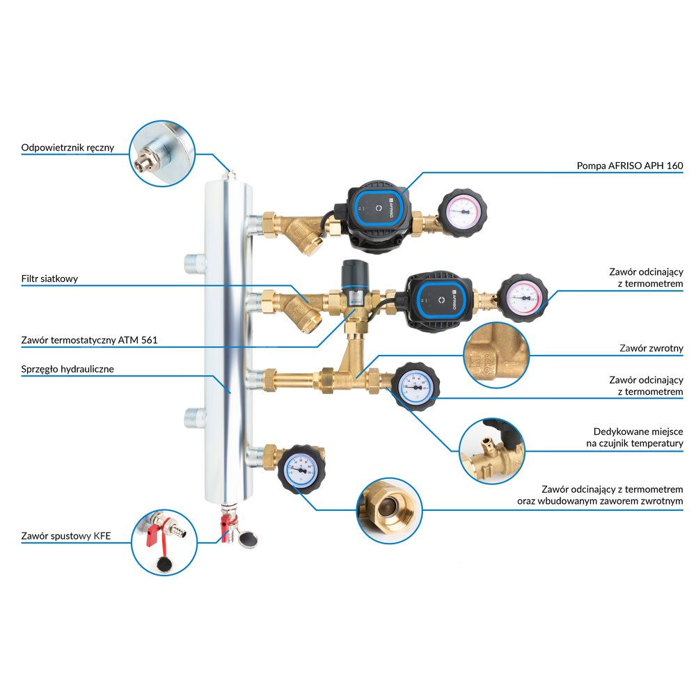 Termostatyczny zawór mieszający ATM 561 (Kvs 2,5 m³/h) z zakresem regulacji temperatury zasilania 20-43°C.
