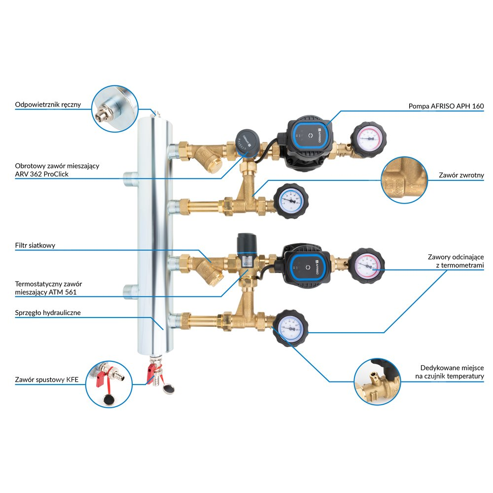 Termostatyczny zawór mieszający ATM 561 (Kvs 2,5 m³/h) z zakresem regulacji temperatury zasilania 20-43°C.