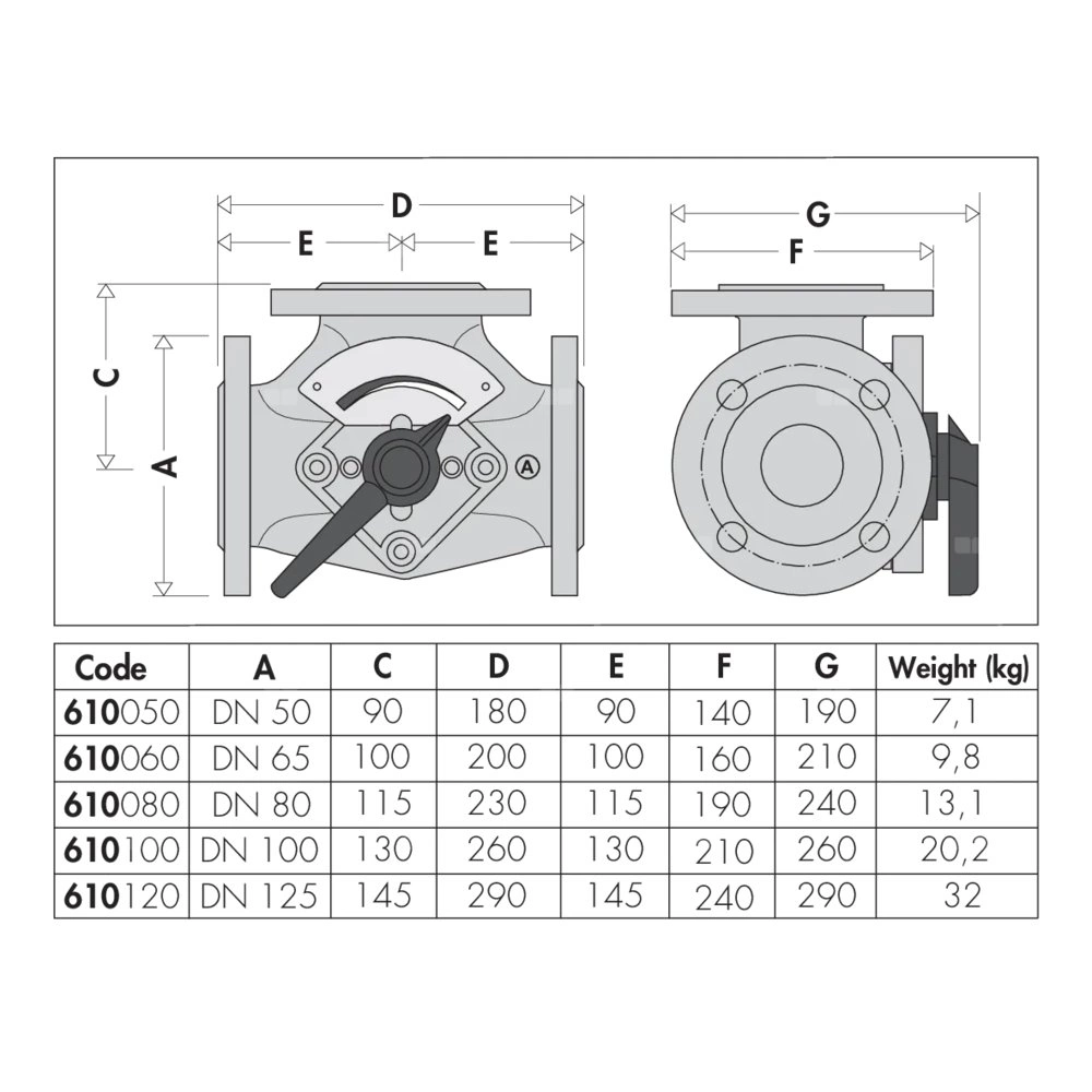Zawór czterodrogowy mieszający z przepustnicą. Przyłącza kołnierzowe Ustawienie fabryczne: zasilanie ze źródła ciepła z prawej strony. Do stosowania w ciężkich warunkach. Przyłącze: DN 80 (EN 1092-1) PN 6. Maksymalne ciśnienie pracy: 6 bar. Zakres temperatury medium: 2–110 °C. PN (Ciśnienie nominalne): PN 6. Kv: 140 m³/h.