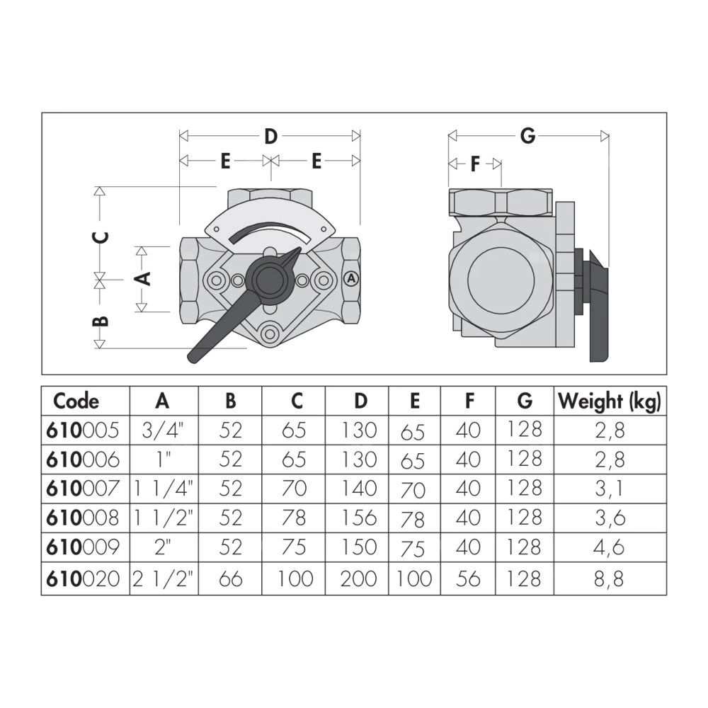 Zawór czterodrogowy mieszający z przepustnicą. Przyłącza gwintowane Ustawienie fabryczne: zasilanie ze źródła ciepła z prawej strony. Do stosowania w ciężkich warunkach. Przyłącze: G 3/4" (ISO 228-1) GW. Maksymalne ciśnienie pracy: 6 bar. Zakres temperatury medium: 2–110 °C. Kv: 7,8 m³/h.