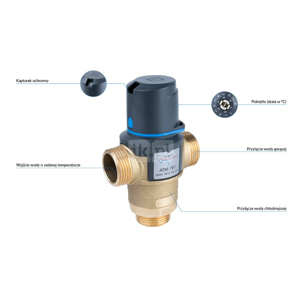 Zawór regulacyjny termostatyczny do wody ciepłej AFRISO ATM 761 mosiądz GZ 1'', DN 20, zakres temp. 20...43'C, Kvs 3.2m3/h, max. 90'C, max. 10bar