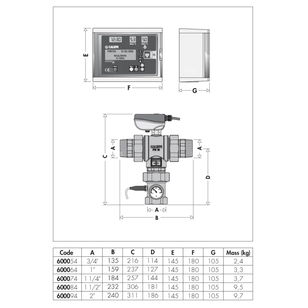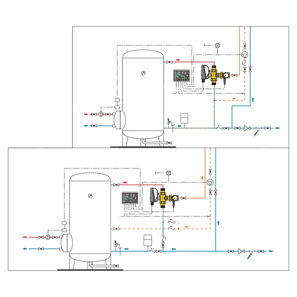 Elektroniczny zawór mieszający z programowalną dezynfekcją termiczną i dezynfekcją kontrolną 24 V. Przyłącza z gwintem zewnętrznym ze złączkami. Z mikroprzełącznikiem pomocniczym Zawiera: - trójdrożny zawór kulowy, - siłownik, - regulator, - czujnik temperatury wody zmieszanej, - czujnik temperatury wody cyrkulacyjnej. Możliwość zdalnego sterowania za pomocą protokołów RS-485 i MODBUS-RTU. Przyłącze: R 1 1/2" (EN 10226-1) GZ, wlot, złączka. Przyłącze: G 1 1/2" (ISO 228-1) GW, wylot. Maksymalne ciśnienie pracy: 10 bar. Zakres temperatury medium: 0–100 °C. Zakres regulacji temperatury: 20–85 °C. Zakres temperatury dezynfekcji: 40–85 °C. Zasilanie elektryczne: 24 V (AC). Pobór mocy: (6,5+6) VA. Stopień ochrony: IP 65. Kv: 32,5 m³/h.