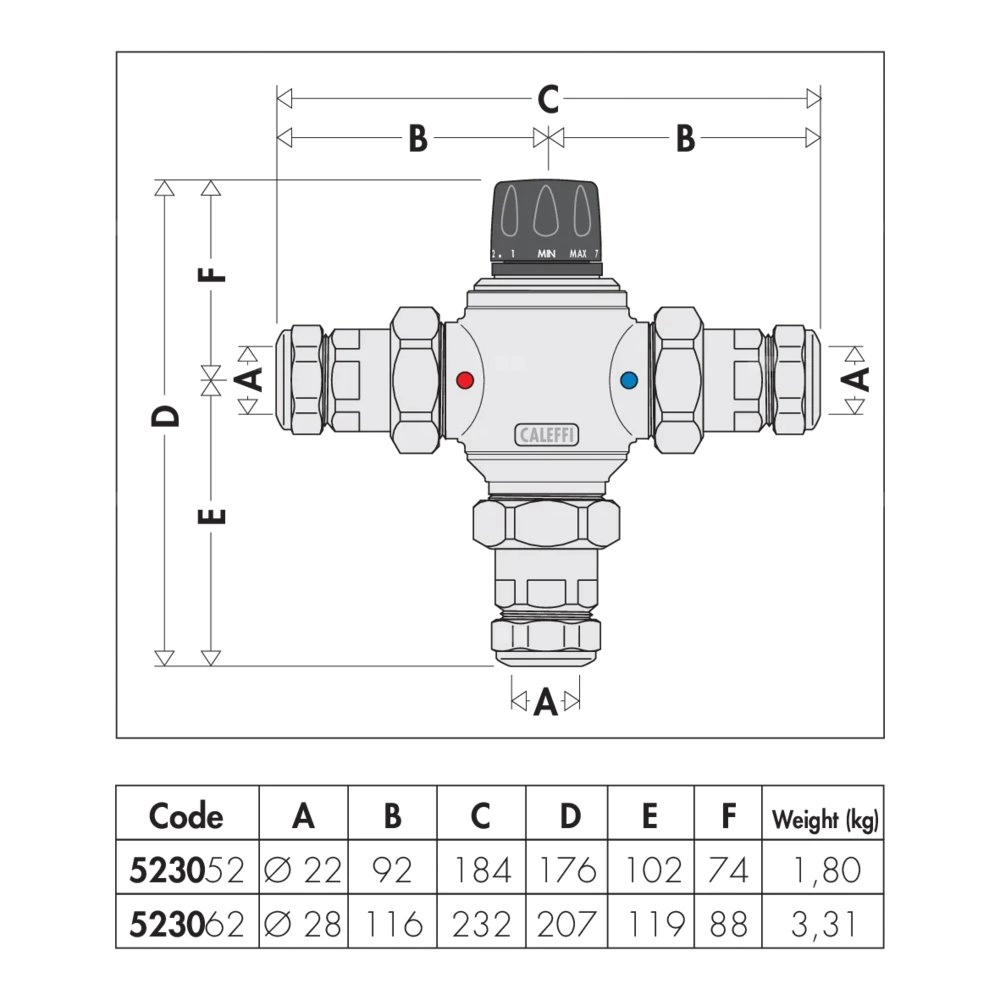 Regulowany termostatyczny zawór mieszający z wymiennym wkładem do systemów scentralizowanych Z zaworami zwrotnymi i złączkami zaciskowymi Przyłącze: Ø 28. Maksymalne ciśnienie pracy: 14 bar. Zakres regulacji temperatury: 30–65 °C. Maksymalna temperatura wlotowa: 85 °C. Kv: 6,9 m³/h. Materiał: mosiądz.