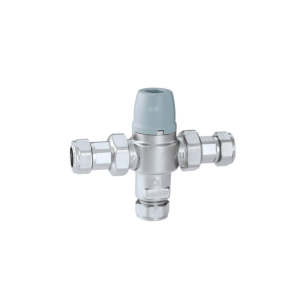Regulowany, termostatyczny zawór mieszający z zaworami zwrotnymi, filtrami i złączkami zaciskowymi O 15 30–50 st. C
