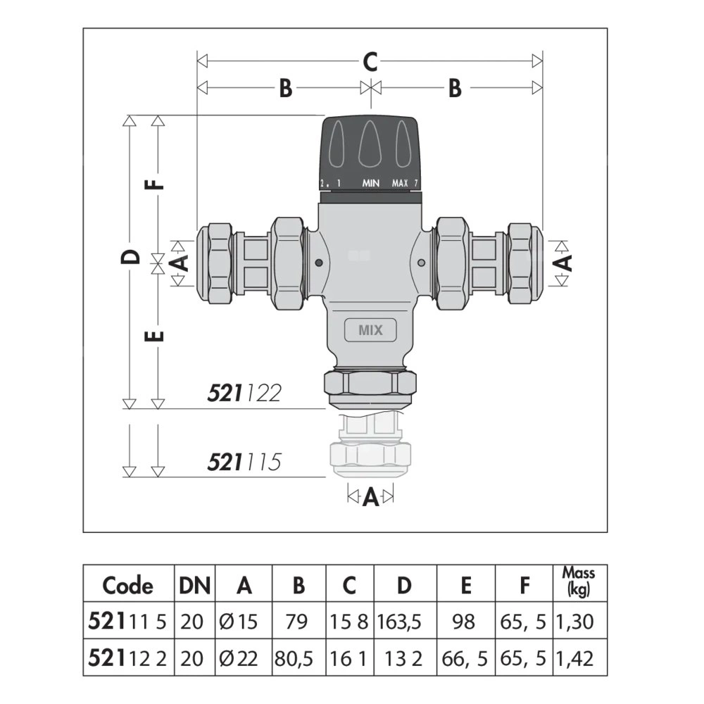 Regulowany termostatyczny zawór mieszający z zaworami zwrotnymi, filtrami na wlotach i złączkami zaciskowymi Certyfikat EN 1287. Przyłącze: Ø 22. Maksymalne ciśnienie pracy: 14 bar. Zakres regulacji temperatury: 30–65 °C. Maksymalna temperatura wlotowa: 85 °C. Wykończenie: chromowane. Kv: 2,6 m³/h. Materiał: stop mosiądzu odporny na odcynkowanie z niską zawartością ołowiu.