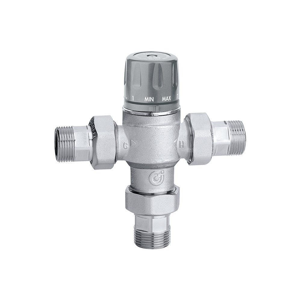 Zawór temperujący regulowany pokrętłem, z zaworami zwrotnymi i filtrami.