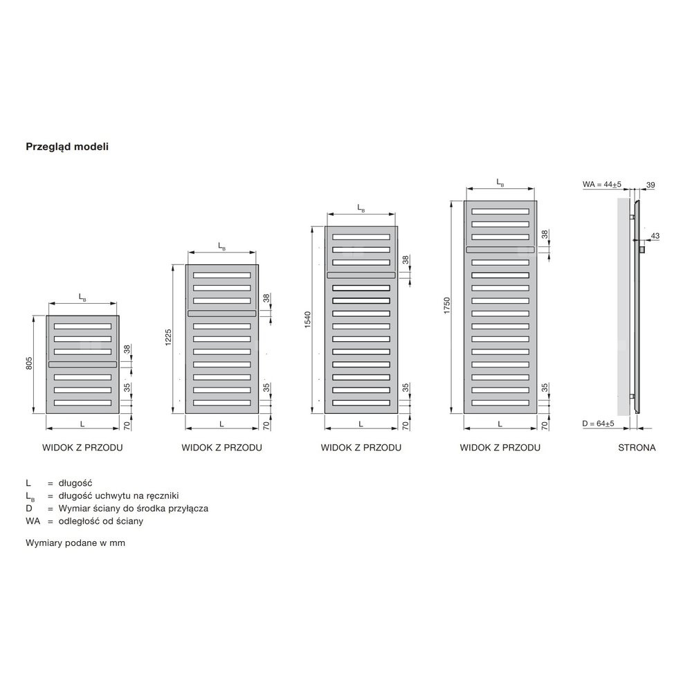 Nowoczesny płaski front, oryginalny trójkątny kolektor, przyłącze środkowe 50mm, chromowany uchwyt na ręczniki