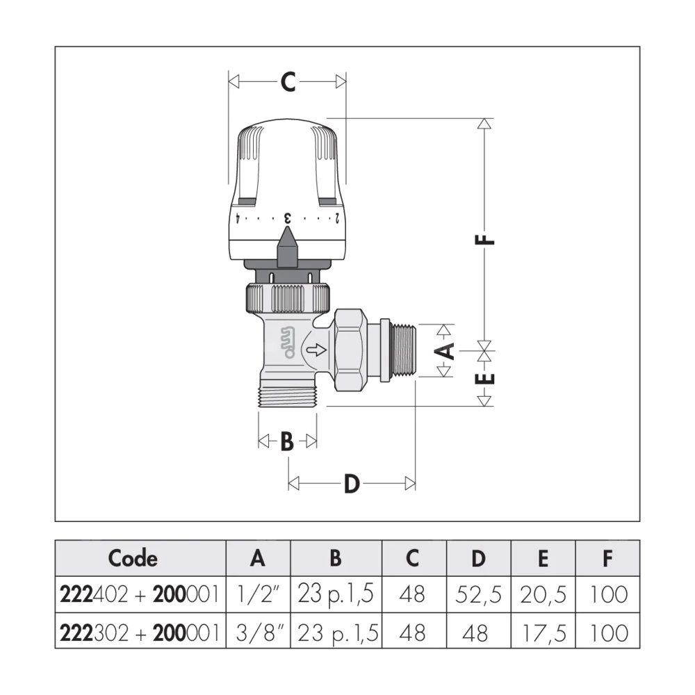 Kątowy grzejnikowy zawór termostatyczny przystosowany do montażu głowic termostatycznych lub siłowników termoelektrycznych. Wersja kątowa. Do rur miedzianych i z tworzyw sztucznych jedno- i wielowarstwowych. podłącznie rury: 23 p. 1,5, wlot, podłączenie kątowe, Podłączenie do złączek Caleffi. podłączenie grzejnika: G 1/2" A (ISO 228-1) GZ, wylot, podłączenie kątowe. Maksymalne ciśnienie pracy: 10 bar. Zakres temperatury medium: 5–100 °C. Wykończenie: chromowane. Kvs: 2,39 m³/h. Materiał: mosiądz.
