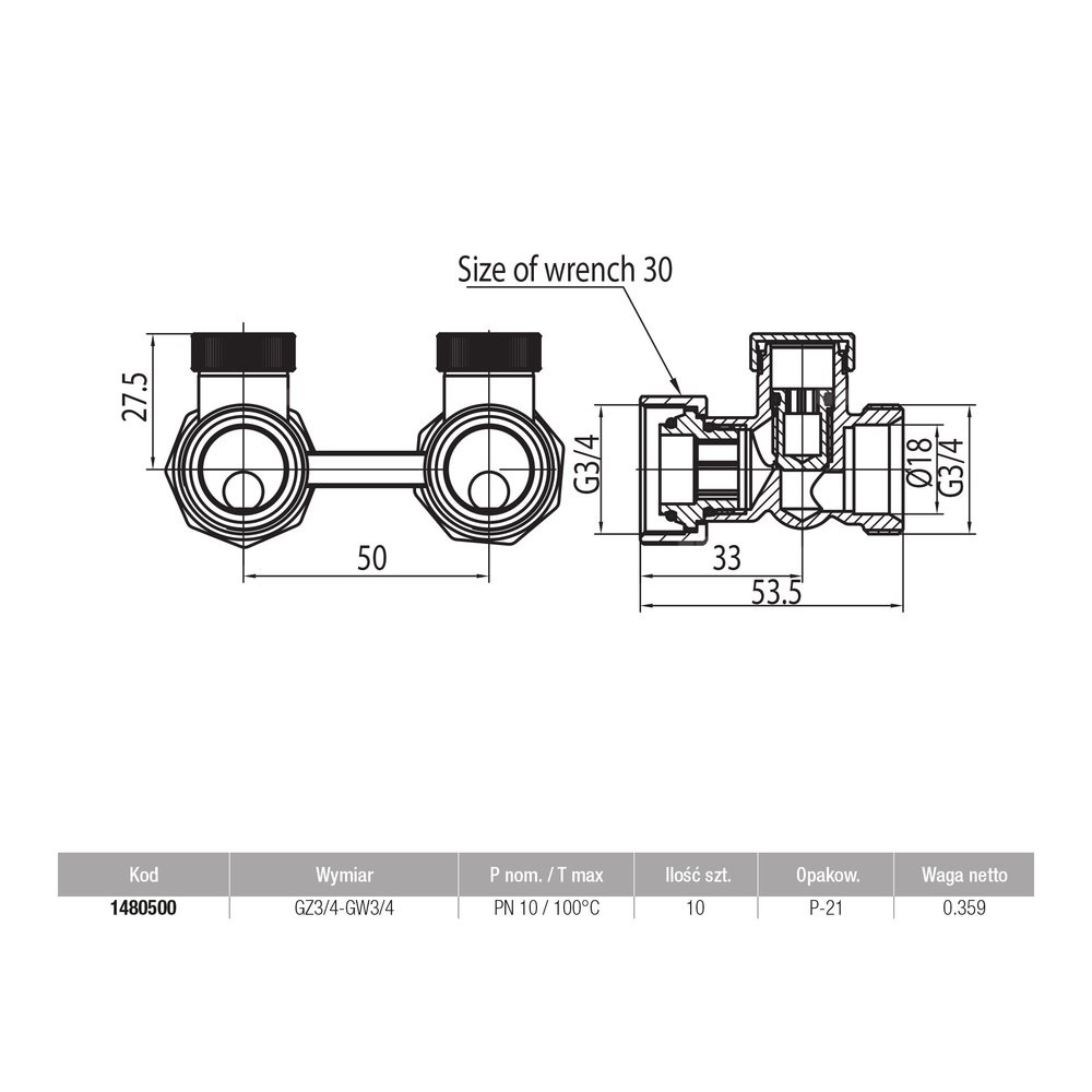 Moduł przyłączeniowy prosty VALVEX FUSION 3 mosiądz (niklowany) 3/4'' x 3/4'', rozstaw 50 mm do grzejników