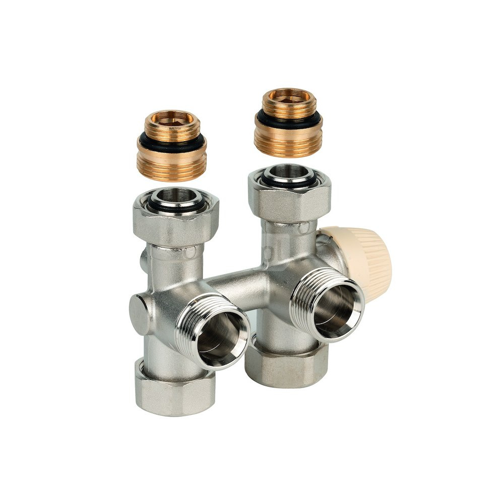 Zawór podwójny Therafix Uniwersal z zespolonym zaworem termostatycznym z wkładką SX, przyłącze grzejnika 3/4" gza, Euroconus, w zestawie nypel redukcyjny na 1/2" oraz osłona ozdobna: biała