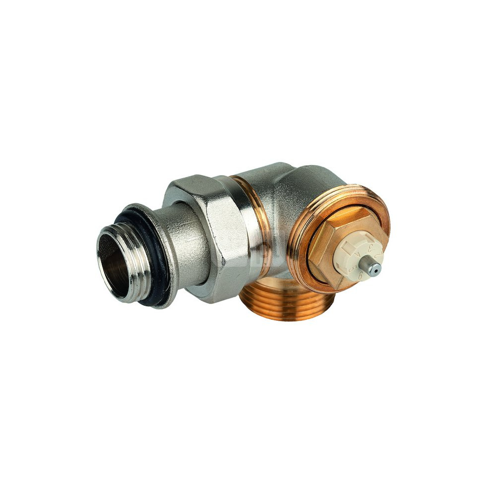 Zawór termostatyczny, narożny prawy, wkładka SX, DN15, gwint zewnętrzny 3/4", ze złączką do grzejnika z uszczelnieniem miękkim