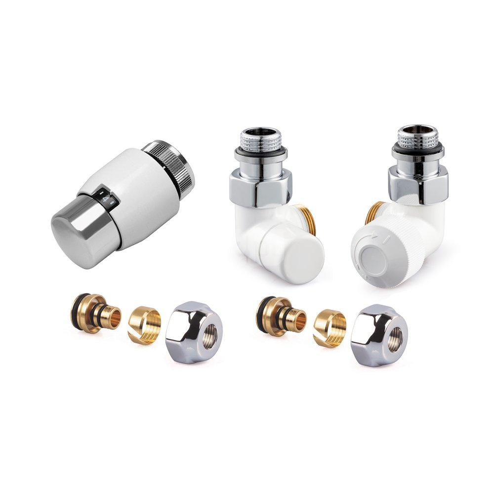 Zestaw BIAŁY do grzejników bocznozasilanych: głowica Thera-200 (biała/chrom) T4021 + Zawór termostatyczny, biały, narożny, prawy, 1/2" V2081RSL15A + zawór powrotny narożny, lewy, 1/2" V2481L0015A + 2x złączka do rur wielowarstwowych FEM24M16X2